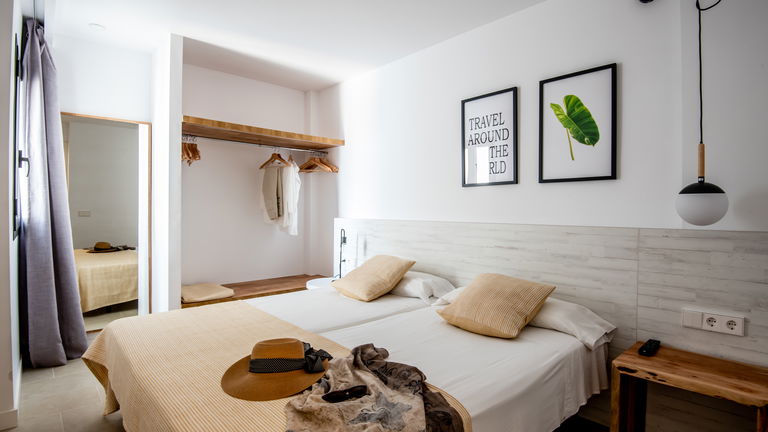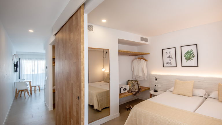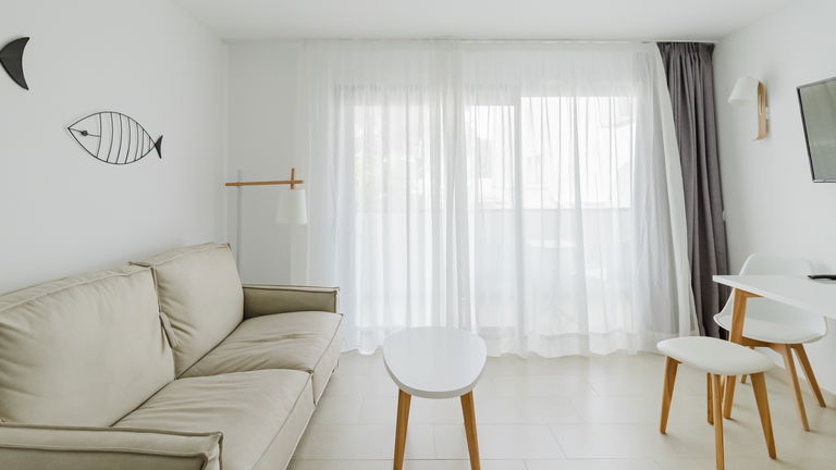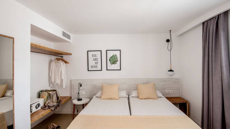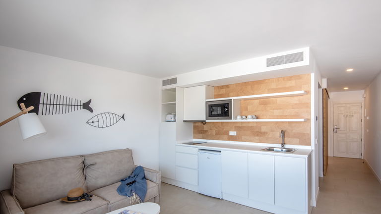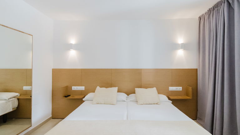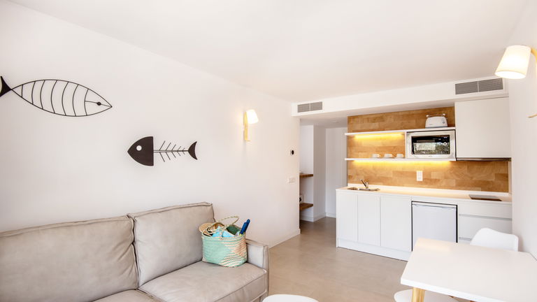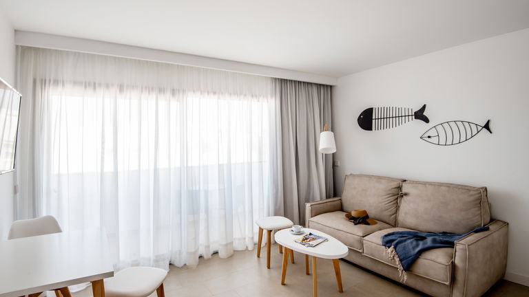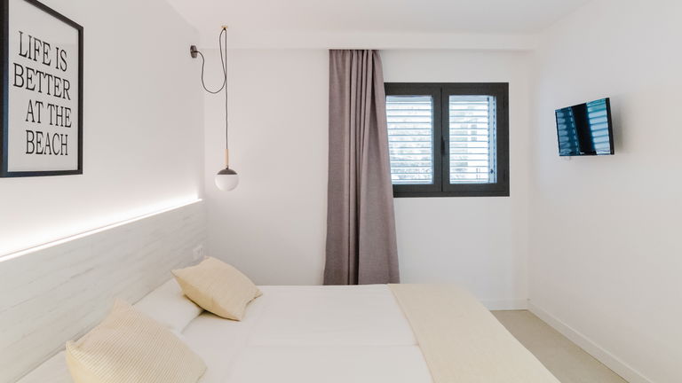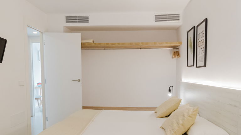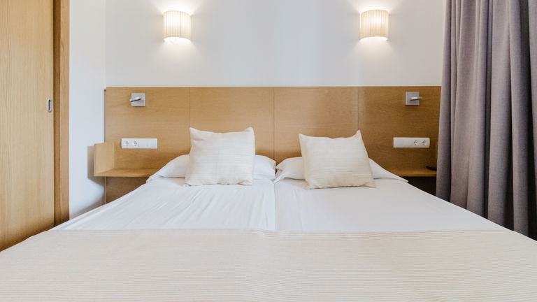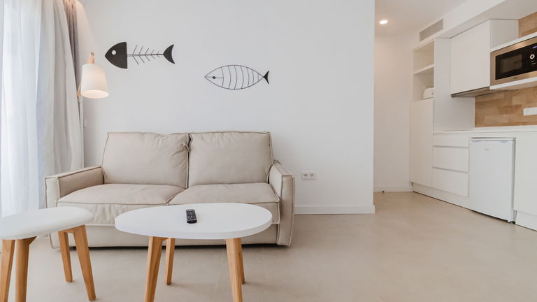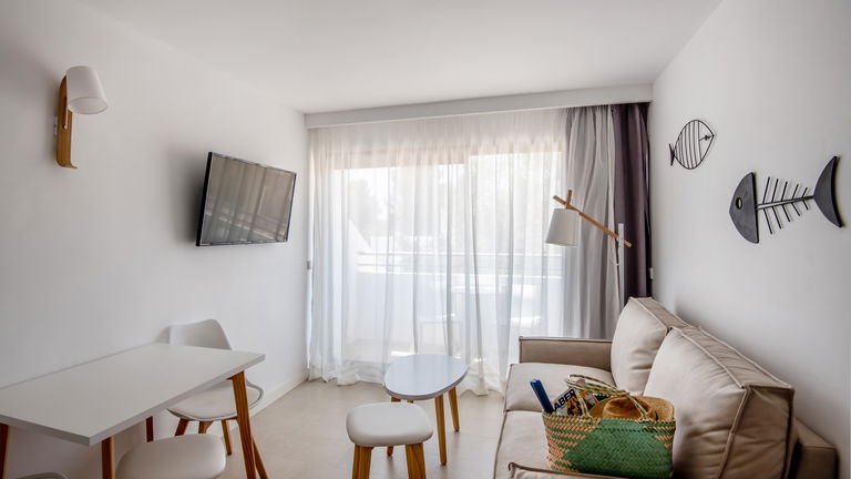 One-bedroom apartments with two single beds, bathroom, fully equipped kitchen with Italian coffee maker and living-dining room with sofa bed, air conditioning and safe. They are characterized by their great luminosity and modern style as well as having a swimming pool, outdoor solarium and cafeteria.
