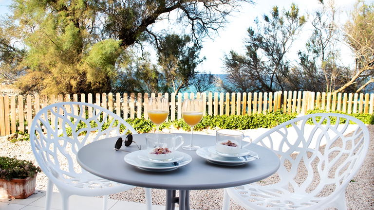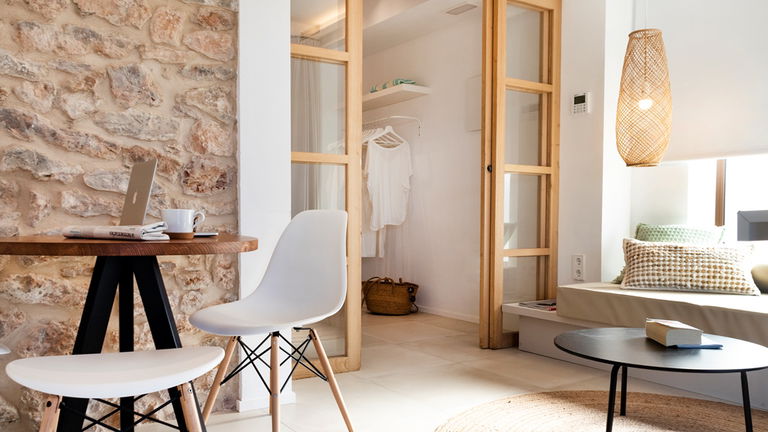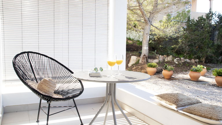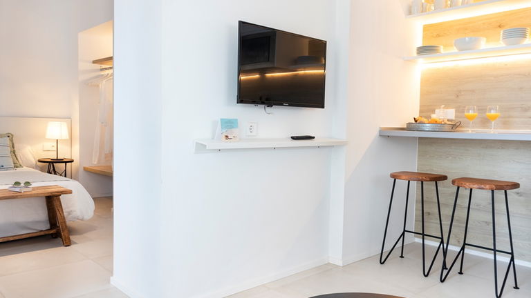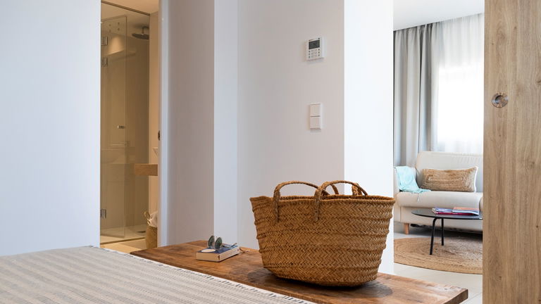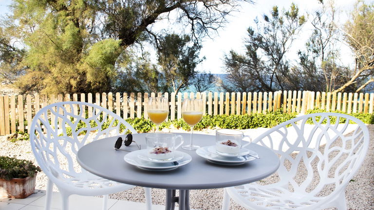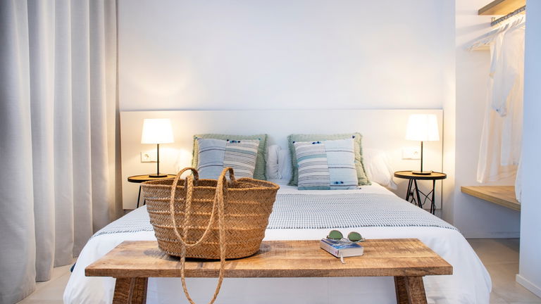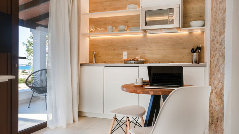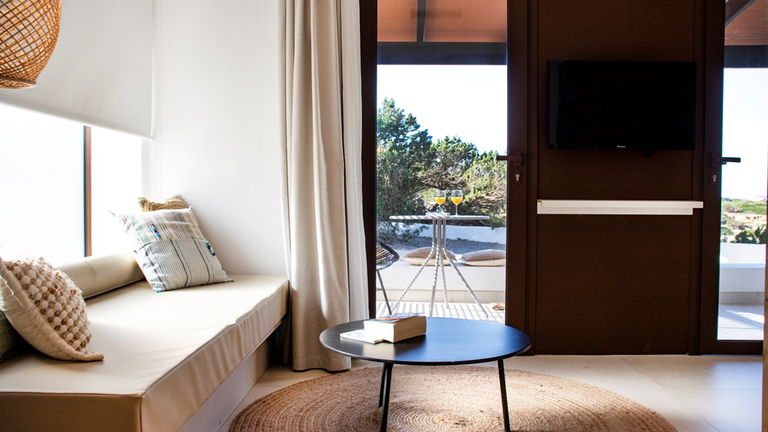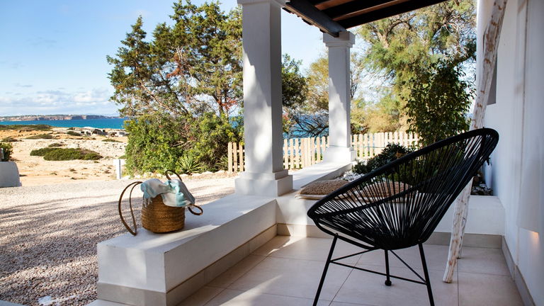 Estudios para 2 personas situados en planta alta y planta baja, con dos camas individuales o cama doble, baño con ducha, cocina totalmente equipada con cafetera italiana y aire acondicionado. Ideal para las personas que buscan tranquilidad y disfrutar del mar de Formentera.