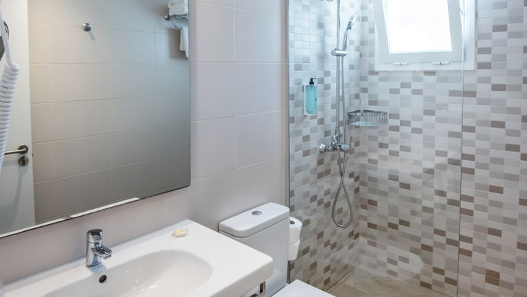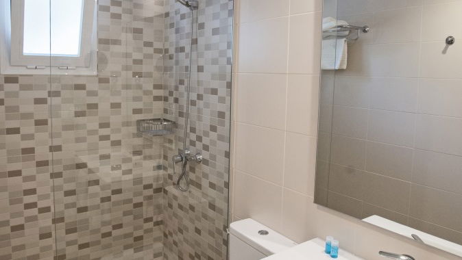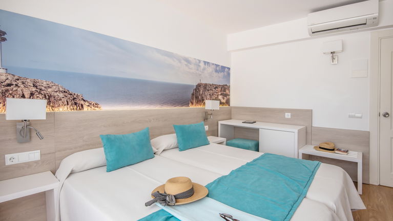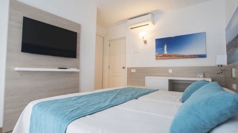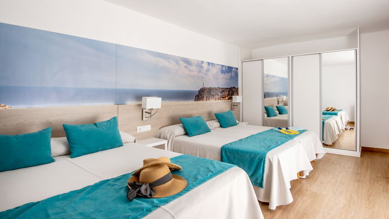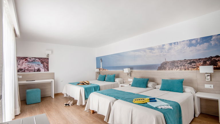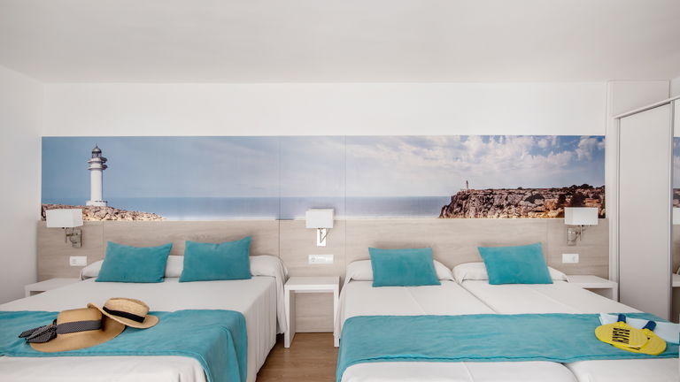 Habitación con capacidad máxima para 4 personas situada en planta alta que consta de 2 camas individuales de 90x1,90m y una cama matrimonial de 1,50x1,90m, baño con ducha, pequeña nevera y aire acondicionado. Ideal para familias o grupos de amigos.