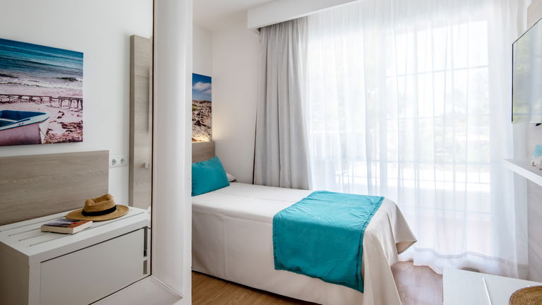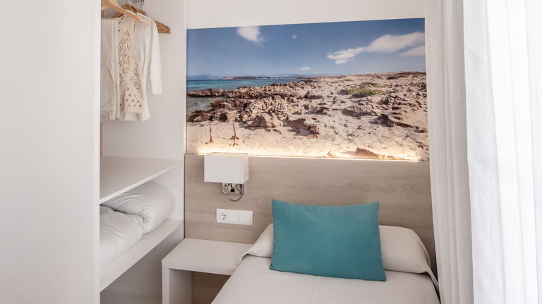 Habitación para 1 persona situada en planta alta que dispone de cama individual, baño con ducha, pequeña nevera y aire acondicionado.