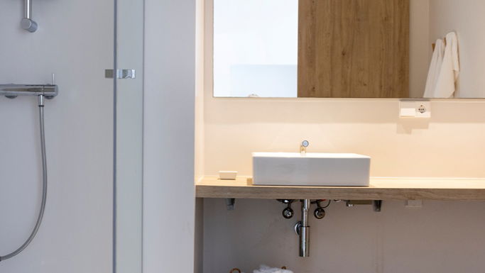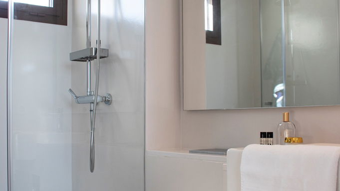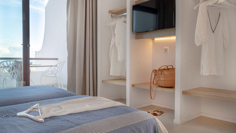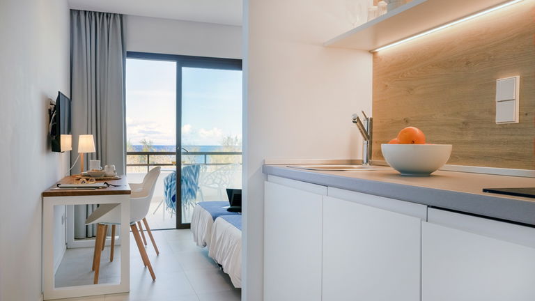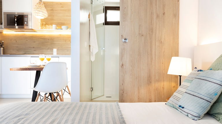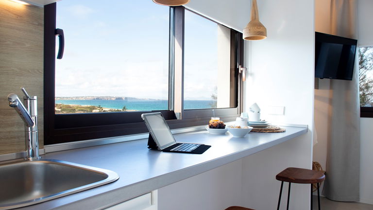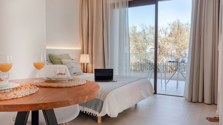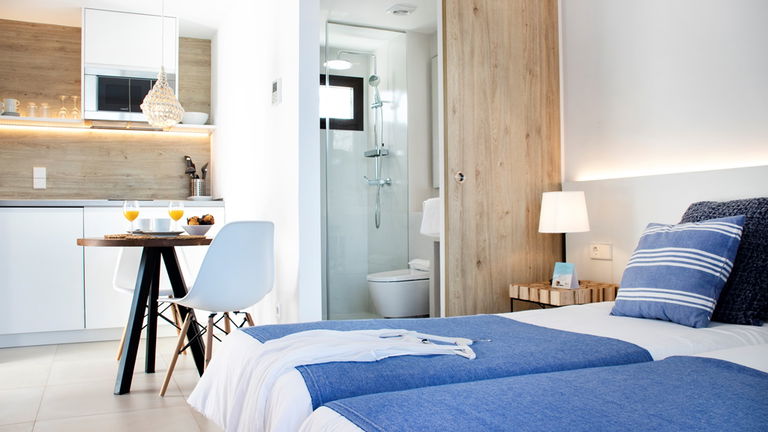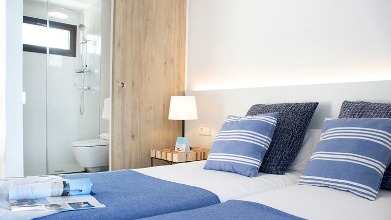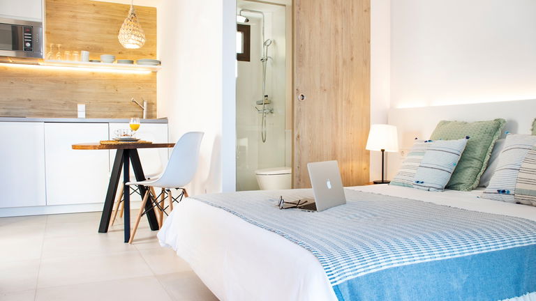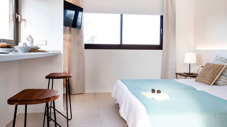 Estudios para 2 personas situados en planta alta y planta baja, con dos camas individuales o cama doble, baño con ducha, cocina totalmente equipada con cafetera italiana y aire acondicionado. Ideal para las personas que buscan tranquilidad y disfrutar del mar de Formentera.