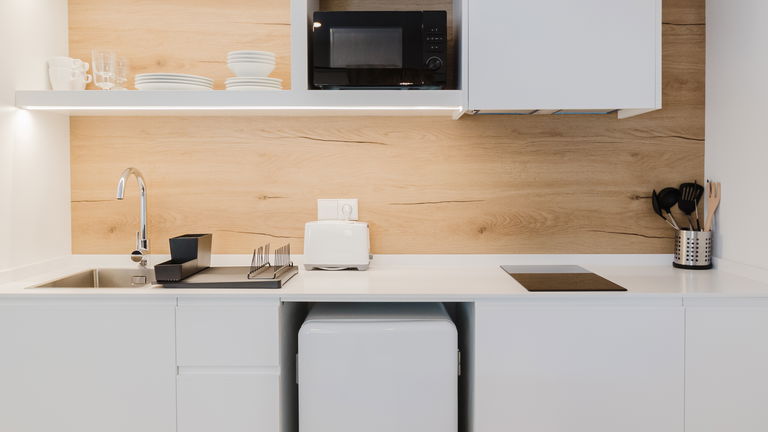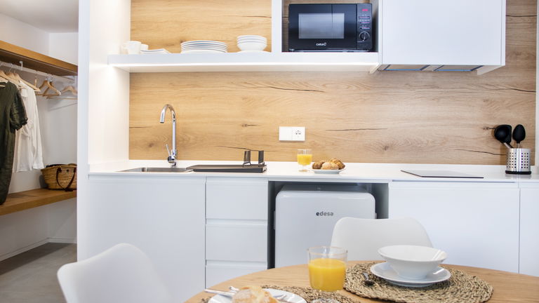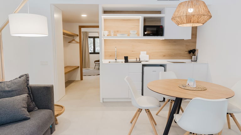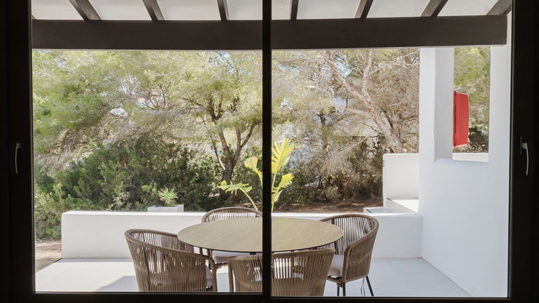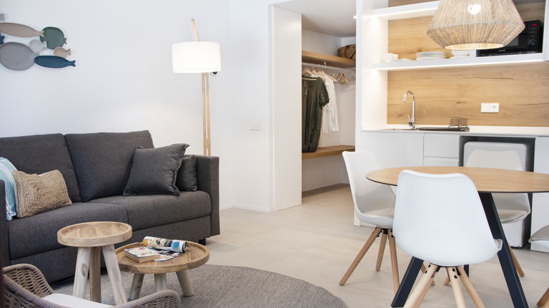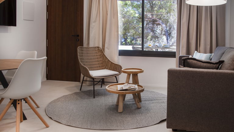 Appartamento con 1 camera da letto ubicato al pianterreno, dotato di viste sulla pineta, terrazza privata di 12 m² con tavolo e sedie, angolo cottura con frigorifero e utensili, e soggiorno con divano e zona pranzo. Tutti gli appartamenti dispongono di aria condizionata.